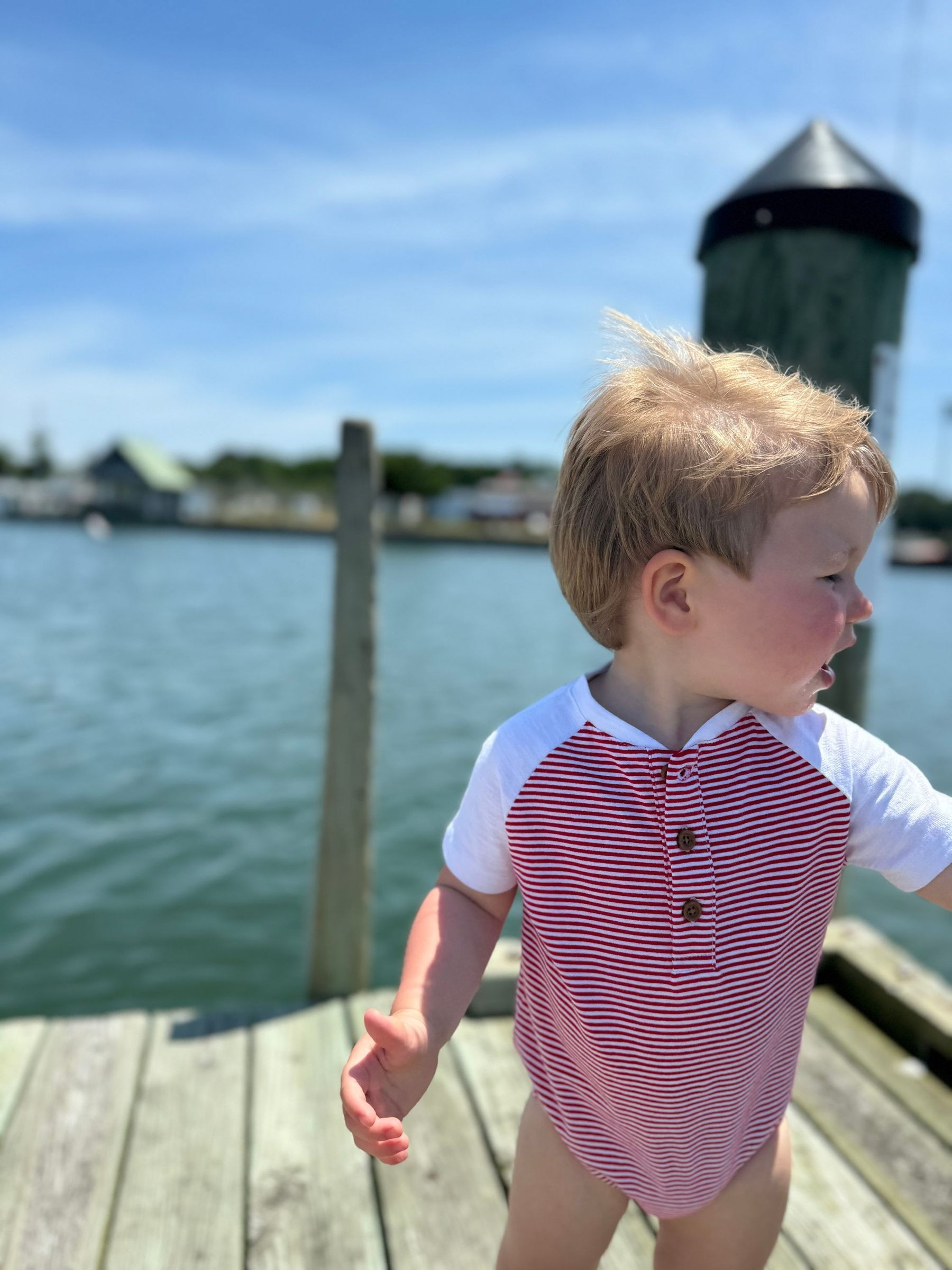 Dress your baby in this timeless red & white striped onesie. With fresh nautical stripes, it's both comfy and charming.